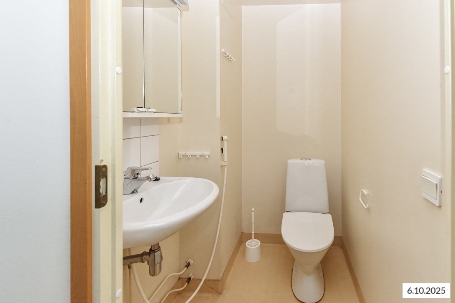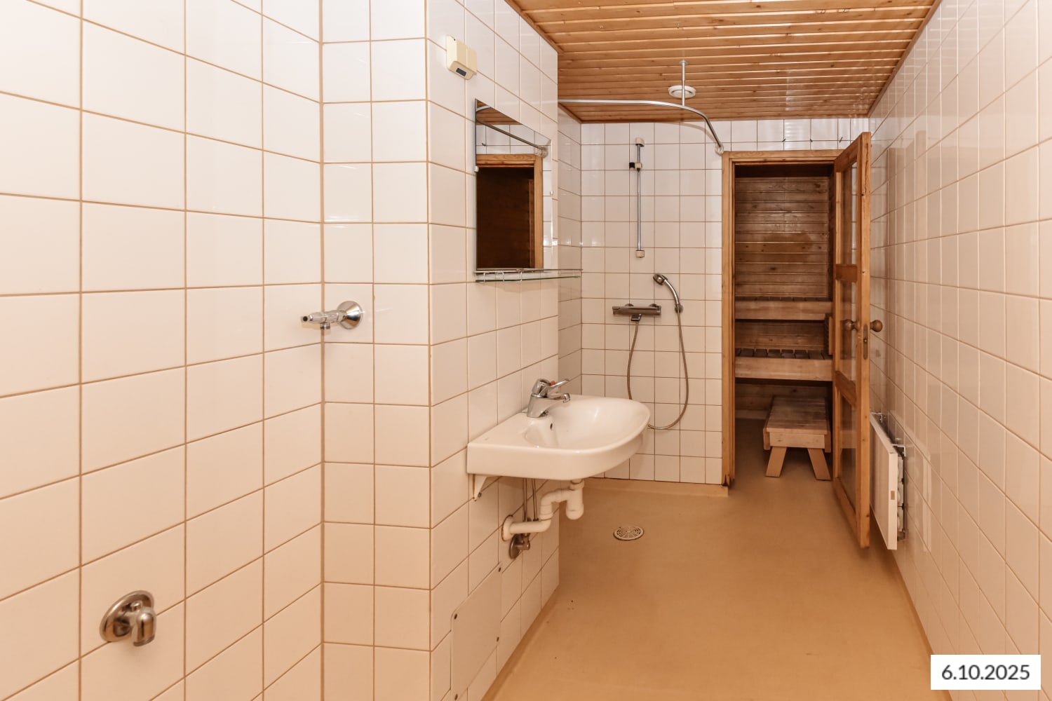 Kylpyhuoneessa on kosteiden tilojen muovimatto ja kaakeloidut seinät. Keittiössä on jää-pakastinkaappi ja nelilevyinen sähköliesi.