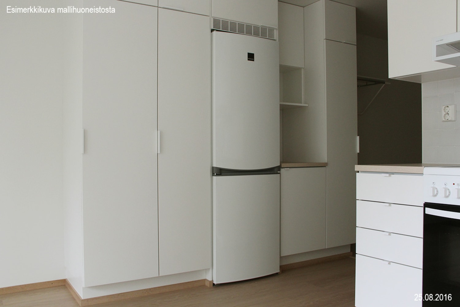 Asuintilojen lattiat ovat tammilaminaattia. Keittiön kaapistojen ovet ovat raikkaan valkoiset ja ylä- ja alakaappien välinen tila on laatoitettu valkoisilla laatoilla. Työtaso on lattian sävyyn sointuvaa tammen sävyistä laminaattia. Varustukseen kuuluu keraaminen liesi, astianpesukone ja kylmälaitteet. Kokonaan laatoitettujen kylpyhuoneiden lattiat ovat rauhallisen harmaat ja vaaleita seiniä elävöittää vaalean keltainen tehosteseinä. Pesukoneelle ja kuivausrummulle on tilavaraus.