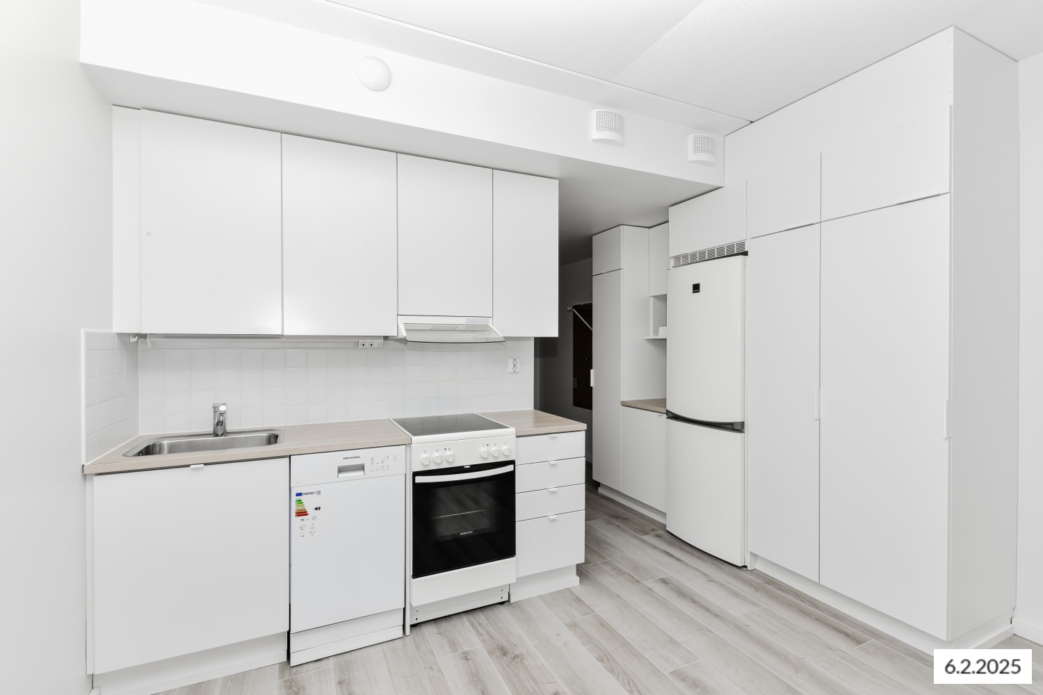 Asuintilojen lattiat ovat tammilaminaattia. Keittiön kaapistojen ovet ovat raikkaan valkoiset ja ylä- ja alakaappien välinen tila on laatoitettu valkoisilla laatoilla. Työtaso on lattian sävyyn sointuvaa tammen sävyistä laminaattia. Varustukseen kuuluu keraaminen liesi, astianpesukone ja kylmälaitteet. Kokonaan laatoitettujen kylpyhuoneiden lattiat ovat rauhallisen harmaat ja vaaleita seiniä elävöittää veden vihreä tehosteseinä. Pesukoneelle ja kuivausrummulle on tilavaraus.