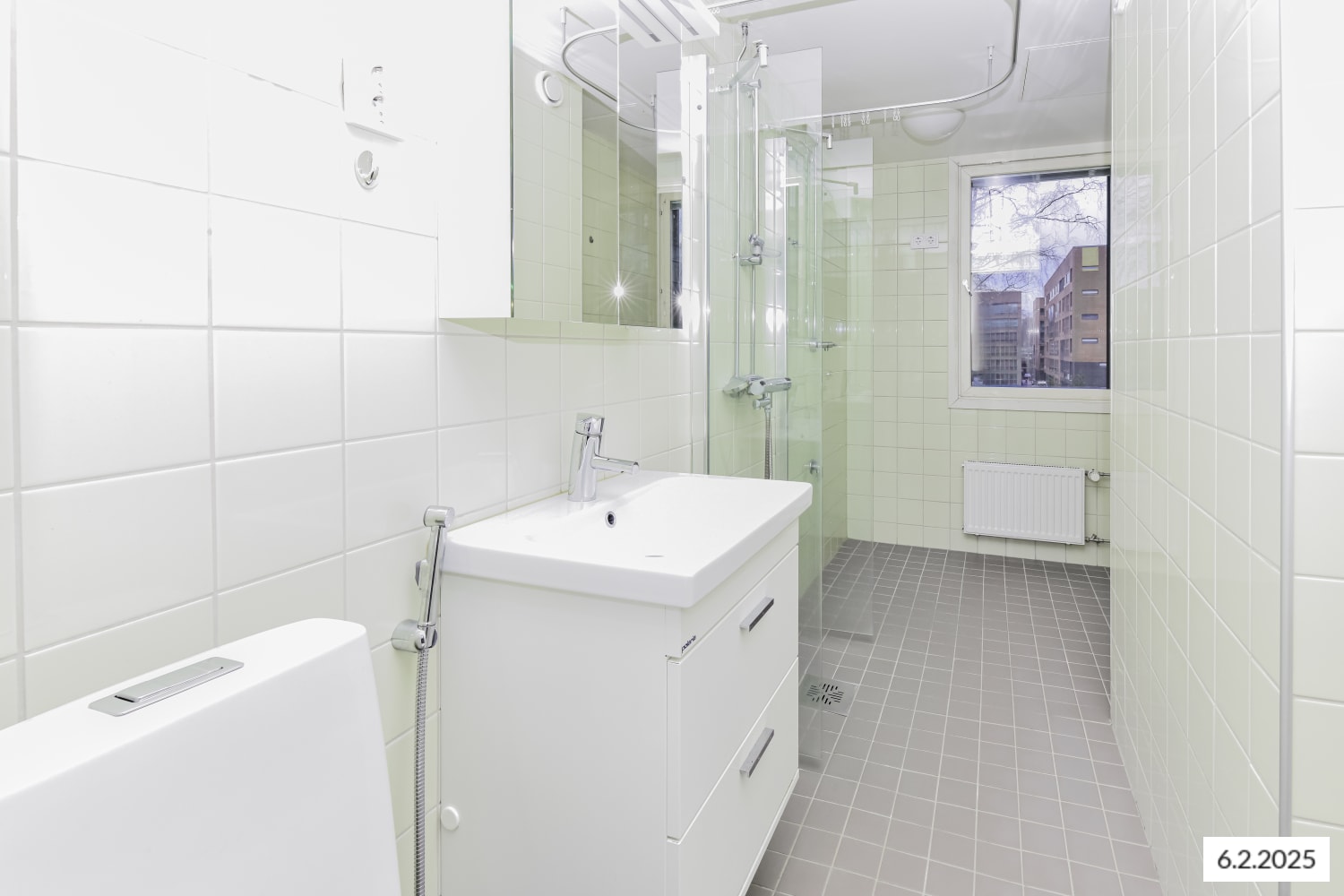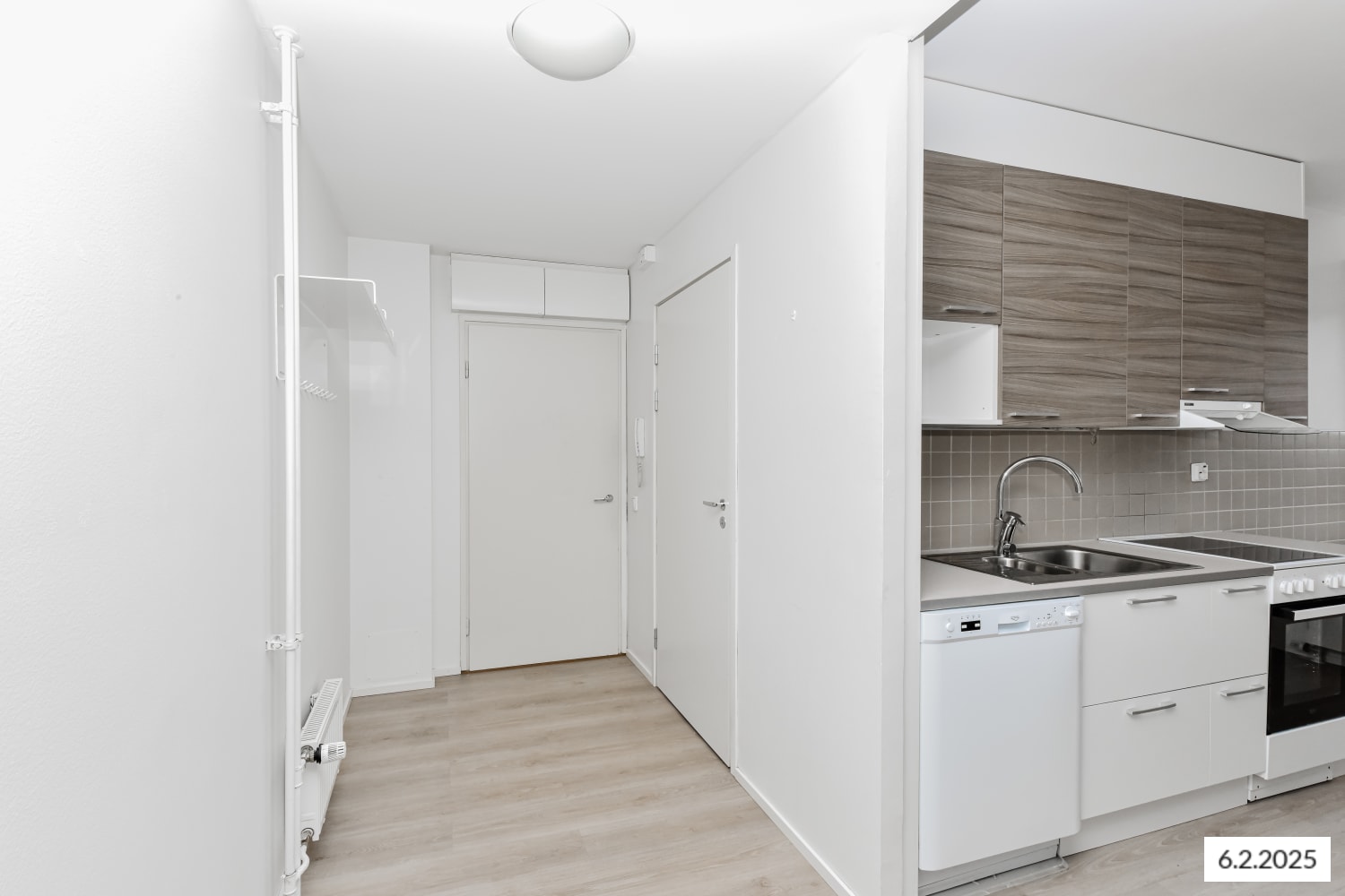 Huoneiston lattiat ovat vaaleanharmaata tammilankkua mukailevaa laminaattia. Keittiössä yläkaapit ovat harmaansävyistä puujäljitelmää ja alakaapit ja korkeat kaapit ovat raikkaan valkoiset. Kaappien ja työtilan väli on laatoitettu harmaalla laatalla. Tiskialtaat on upotettu valko-harmaaseen laminaattityötasoon. Keittiön varusteisiin kuuluu keraaminen liesi, astianpesukone, jääkaappipakastin sekä varaus mikroaaltouunille. Valoisassa, ikkunallisessa kylpyhuoneessa on vihertävät seinälaatat ja harmaat lattialaatat, kalusteet ovat valkoisia. Pyykinpesukoneelle ja kuivausrummulle on varaus.