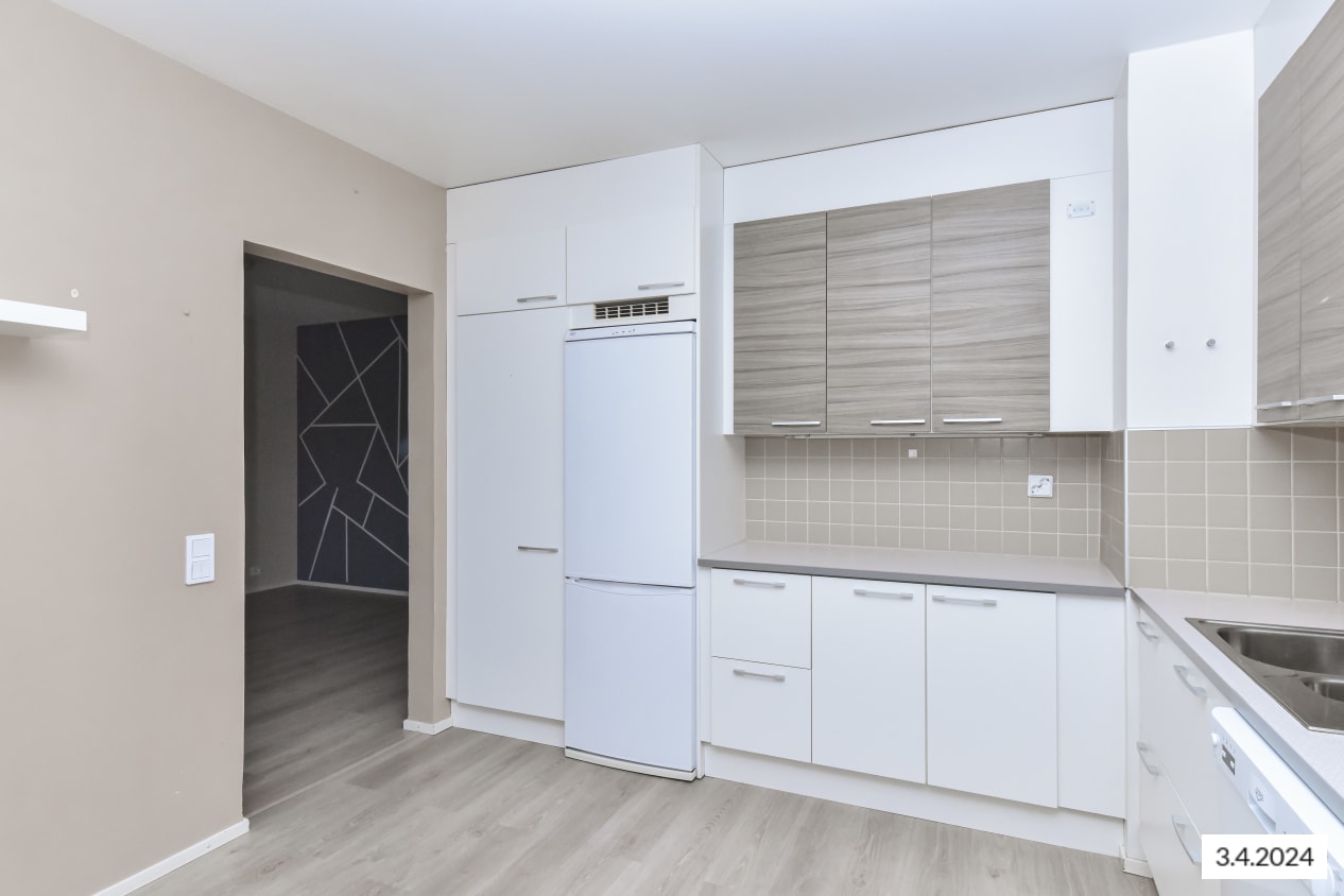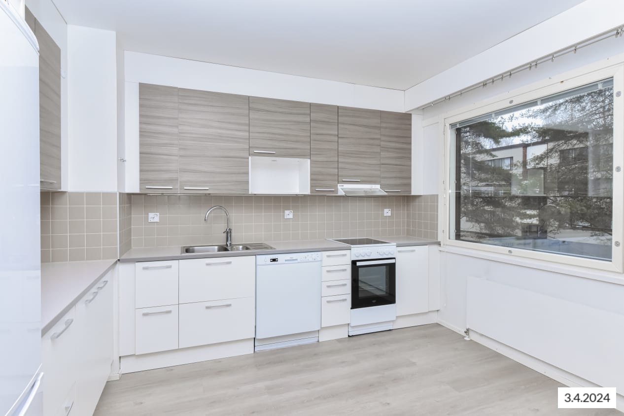 Huoneiston lattiat ovat vaaleanharmaata tammilankkua mukailevaa laminaattia. Keittiössä yläkaapit ovat harmaansävyistä puujäljitelmää ja alakaapit ja korkeat kaapit ovat raikkaan valkoiset. Kaappien ja työtilan väli on laatoitettu harmaalla laatalla. Tiskialtaat on upotettu valko-harmaaseen laminaattityötasoon. Keittiön varusteisiin kuuluu keraaminen liesi, astianpesukone, jääkaappipakastin sekä varaus mikroaaltouunille. Tilavassa kylpyhuoneessa on vihertävät seinälaatat ja harmaat lattialaatat, kalusteet ovat valkoisia. Pyykinpesukoneelle ja kuivausrummulle on varaus.
