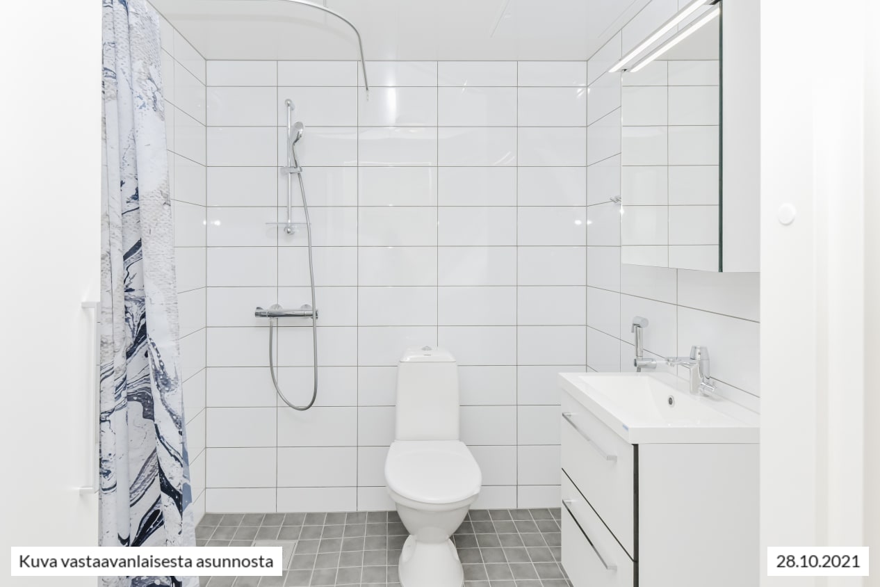 Varustukseen kuuluu keraaminen liesi, liesikupu, jääkaappipakastin ja astianpesukone. Kodinkoneet ovat valkoisia. Kylpyhuoneessa on valkoiset SATOn Kide-malliston kalusteet ja paikka pyykinpesukoneelle. Seinät ovat valkoista laattaa ja lattia on harmaa.