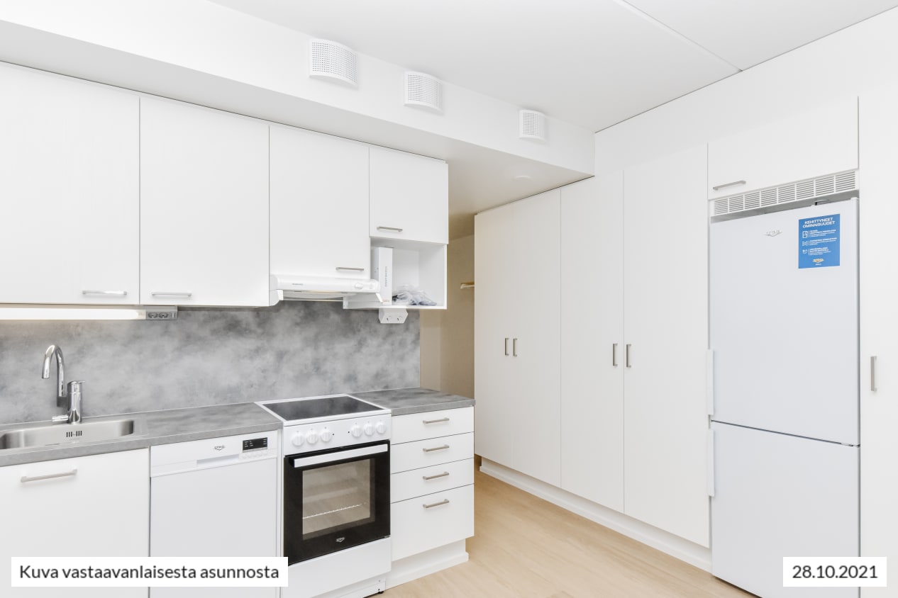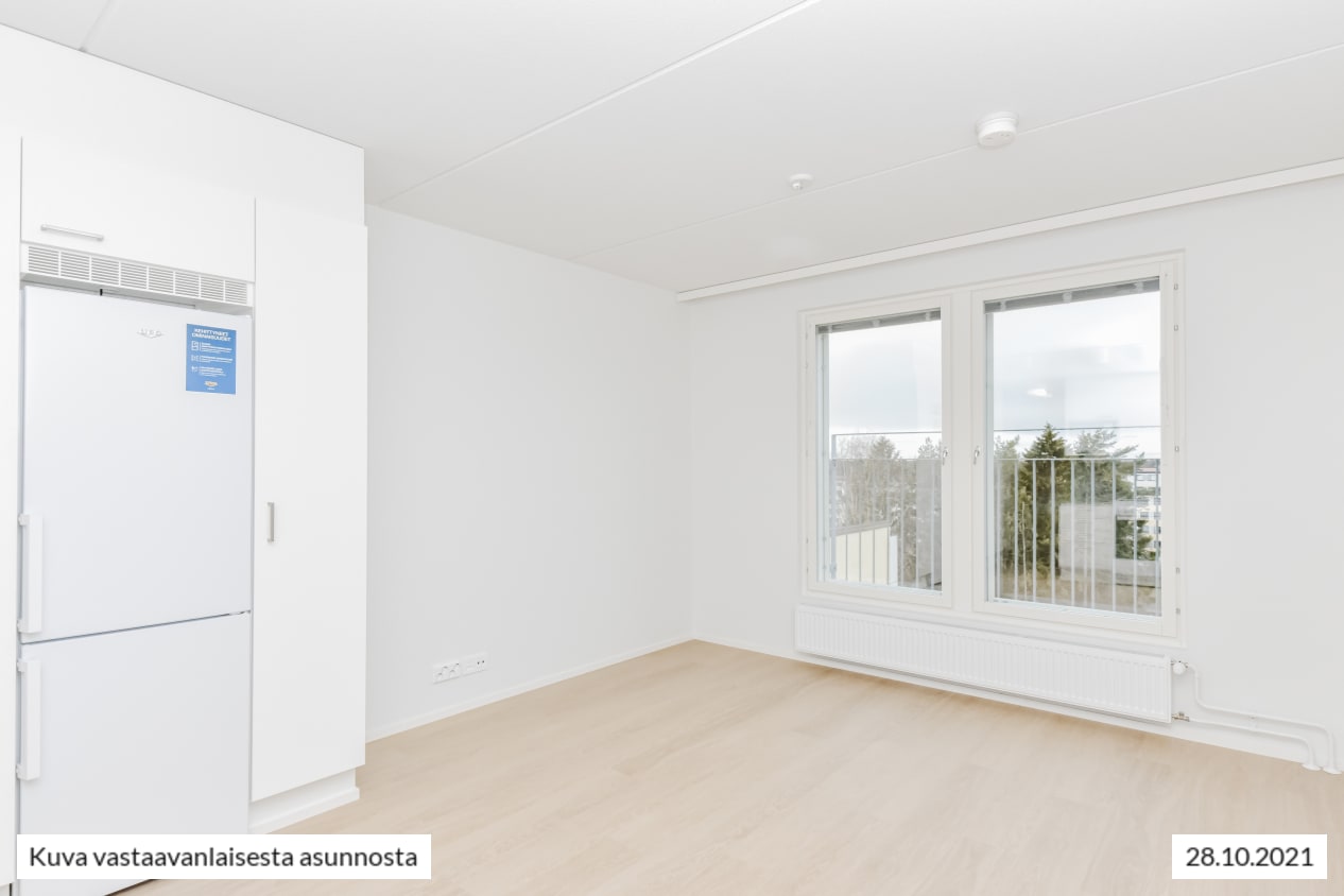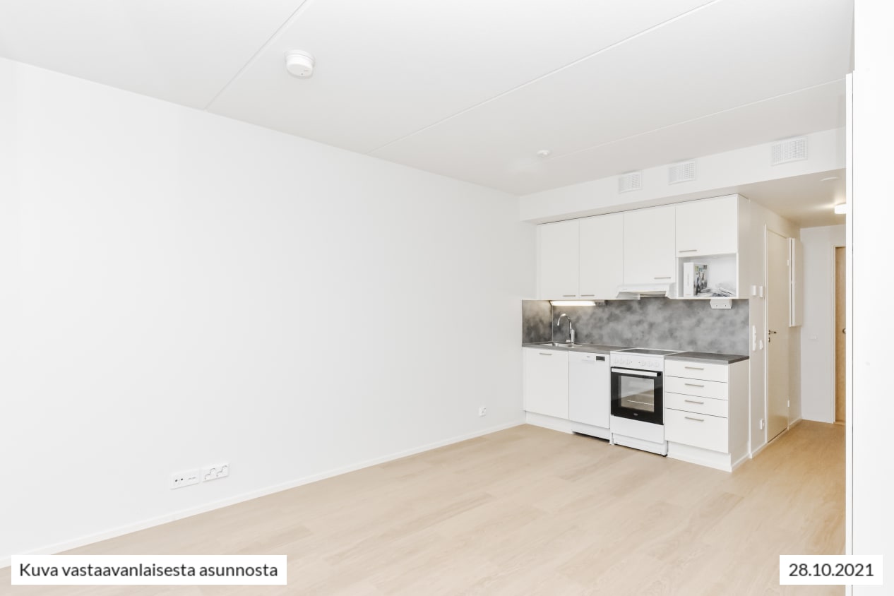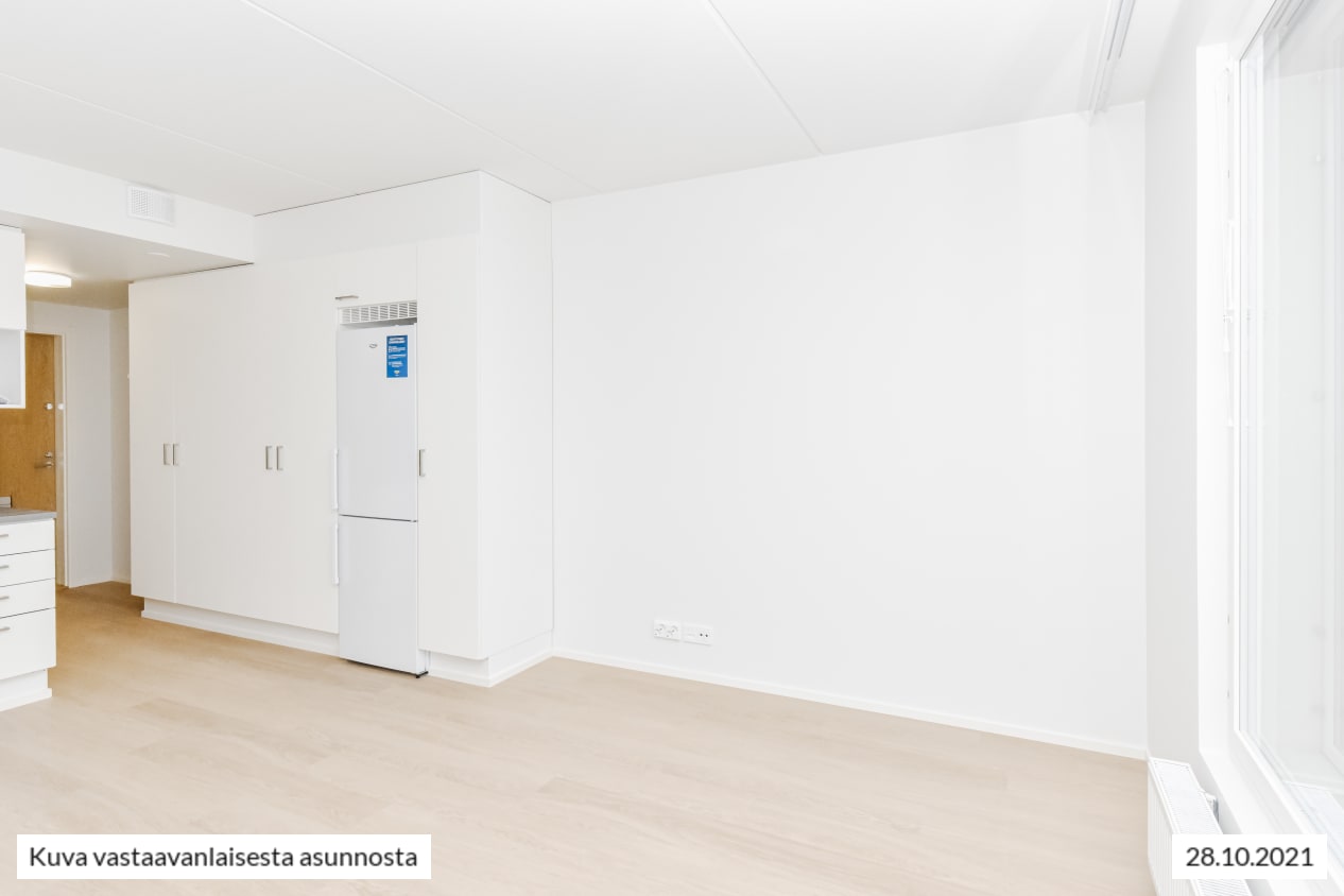 Syksyllä 2021 valmistunut yksiö on selkeä ja ajattoman kaunis. Keittiö ja olohuone yhdistyvät avoimeksi oleskelualueeksi ja tilaan ilmavuutta ja luonnon valoa tuovat isot, avattavat ikkunat, joiden takana on metallinen pinnakaide. Kodin pintamateriaalit ovat vaaleita ja sopivat moneen makuun. Lattia on vaaleaa tammilaminaattia ja seinät on maalattu valkoisiksi. Linjakkaassa avokeittiössä on valkoiset, puusyykuvioiset kaapistot. Ylä- ja alakaappien välinen tila ja työtaso ovat harmaata laminaattia.