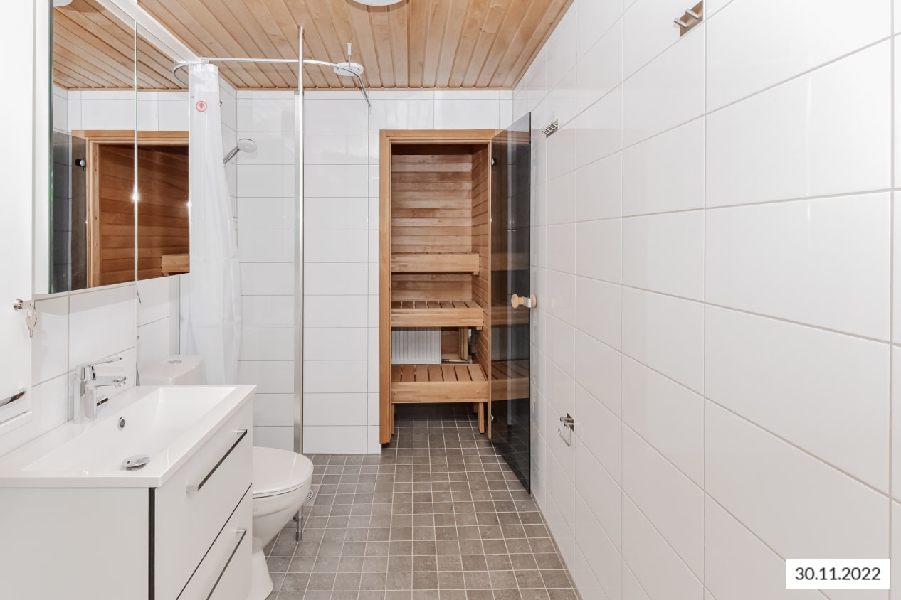Kylpyhuoneessa on valkoiset SATOn Kide-malliston kalusteet ja kaakeloidut seinät. Pesukoneellesi on myös paikka. Säilytystilaa löytyy vaatehuoneesta.