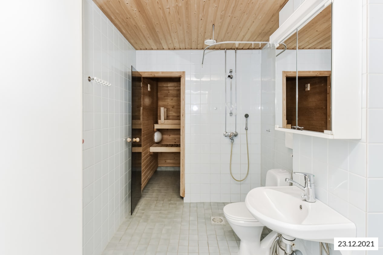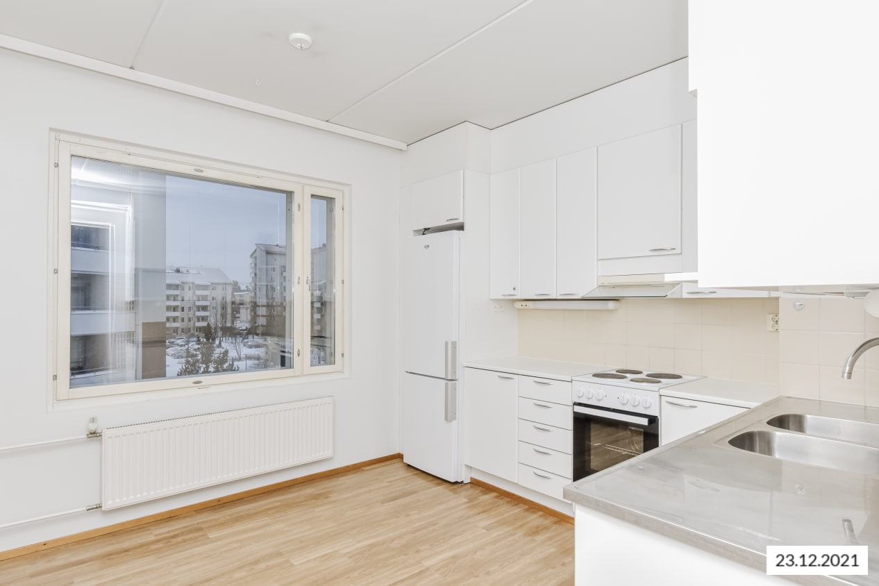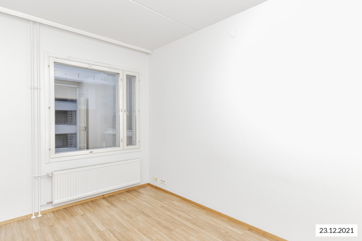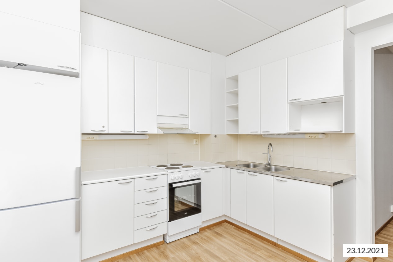 Asuinhuoneiden lattiamateriaalina on laminaatti ja kylpyhuone on kauttaaltaan kaakeloitu. Keittiössä on jää-pakastinkaappi.