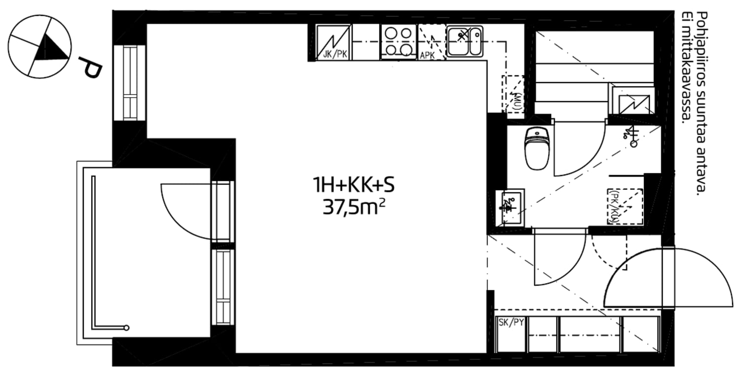 Fiksupohjaisessa vuokra-asunnossa kalusteet löytävät paikkansa vaivattomasti, mutta toisaalta valinnanvaraakin sisustamisessa on. Esimerkiksi keittokomeron vieressä olevaan tilaan mahtuu varsin hyvin pöydän sijasta sänky, ja pöydän voi sijoittaa kylpyhuoneen vastaiselle seinälle. Suojaisa sisäänvedetty parveke avautuu ihanasti eteläaurinkoon.