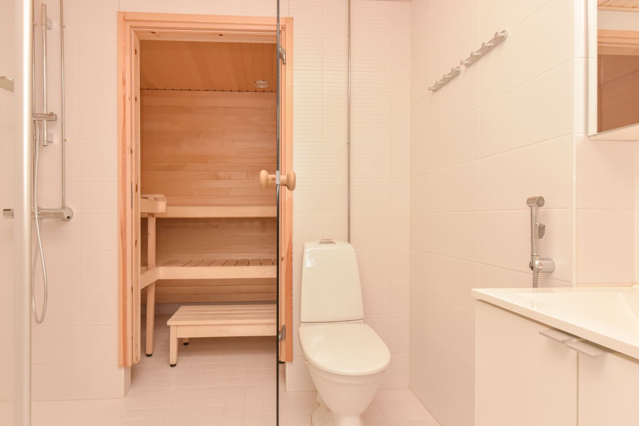 Asuinhuoneissa on valkolakattua tammea mukaileva laminaattilattia. Valkoisella kaakeloidussa kylpyhuoneessa on varpaiden alla ylellinen lattialämmitys ja saunan ilmettä nostaa valokuituvalaistus. Keittiökaapistot ovat valkoiset, samoin keraaminen liesi ja jää-pakastinkaappi. Astianpesukone on integroitu kalusteisiin. Eteiskäytävään valoa heijastavat vaatekaappien peiliovet.