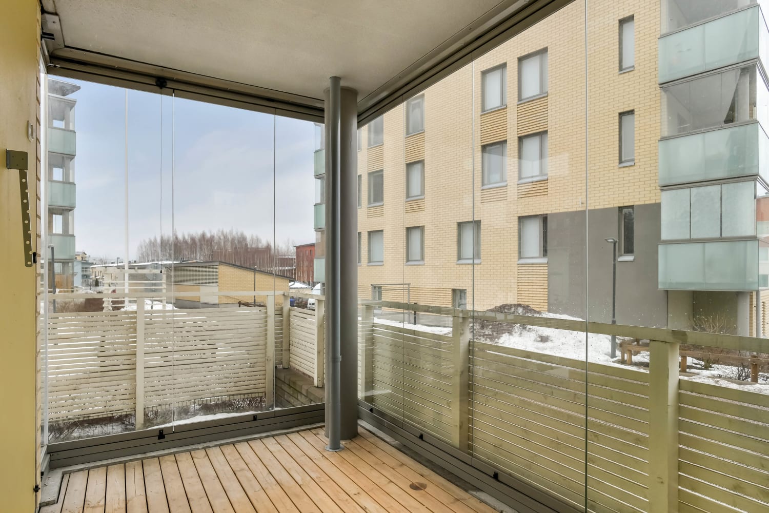 Tämän vaaleapintaisen vuokra-asunnon varma valtti on iso piha lasitettuine eteläterasseineen. Kodin kompakti koko ei ole verottanut säilytystilaa ja kahteen suuntaan antavat ikkunat tuovat tilan tuntua avaraan olohuoneeseen.