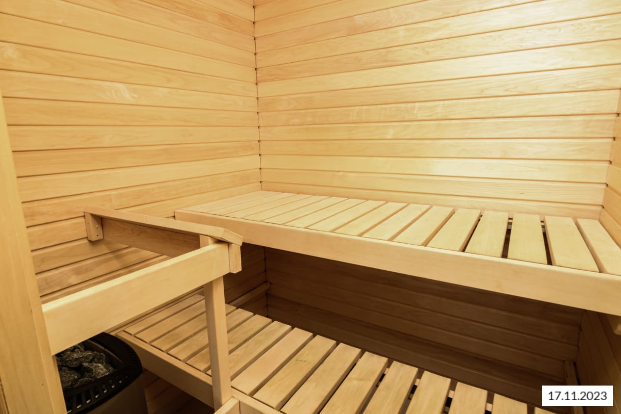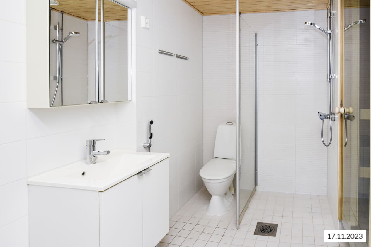 Asuinhuoneissa on valkolakattua tammea mukaileva laminaattilattia. Valkoisella kaakeloidussa kylpyhuoneessa on varpaiden alla ylellinen lattialämmitys ja saunan ilmettä nostaa valokuituvalaistus. Keittiökaapistot ovat valkoiset, samoin keraaminen liesi ja jää-pakastinkaappi. Astianpesukone on integroitu kalusteisiin. Eteiskäytävään valoa heijastavat vaatekaappien peiliovet.