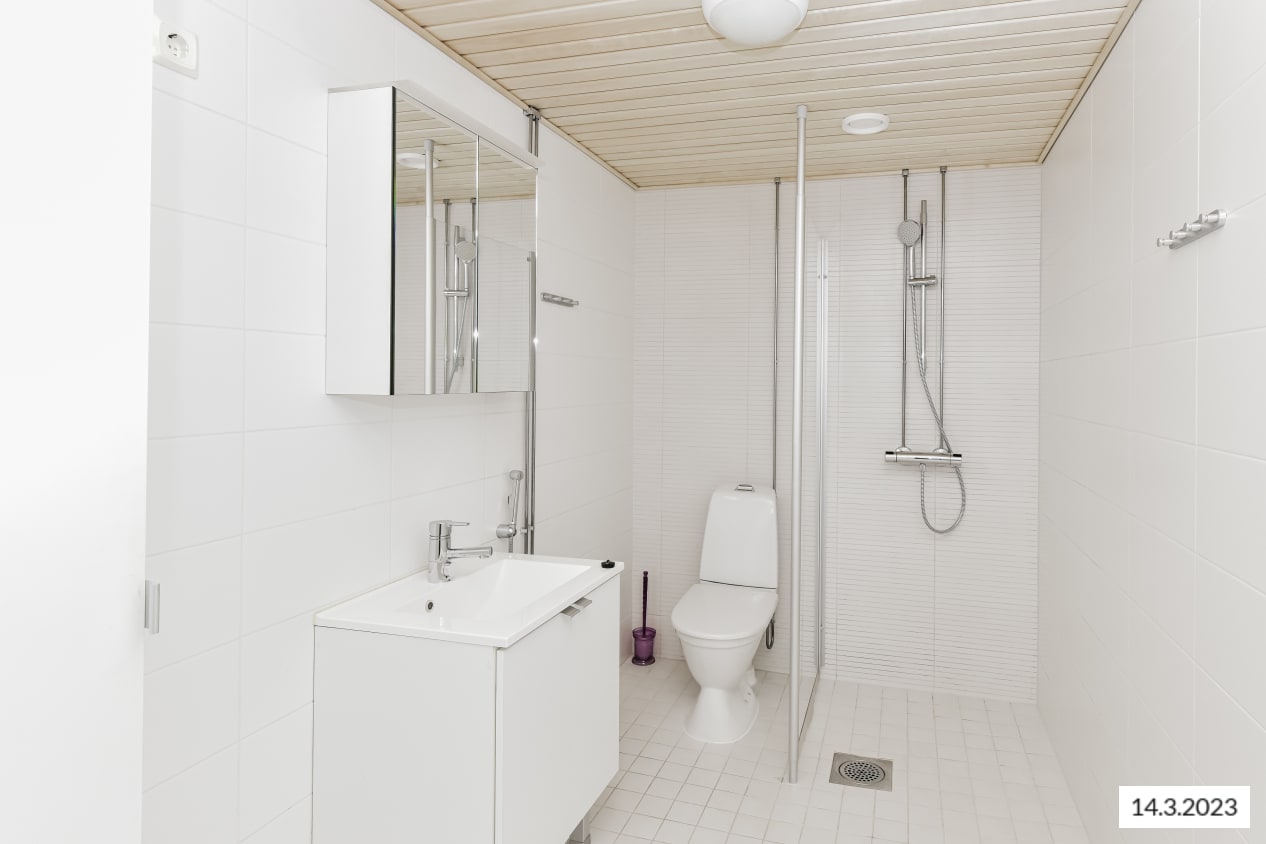 Lattiat ovat valkolakattua tammea mukailevaa laminaattia. Valkoisella kaakeloidussa kylpyhuoneessa on varpaiden alla ylellinen lattialämmitys. Keittiökaapistot ovat valkoiset, samoin keraaminen liesi ja jää-pakastinkaappi. Astianpesukone on integroitu kalusteisiin. Eteiseen valoa heijastavat vaatekaappien peiliovet.