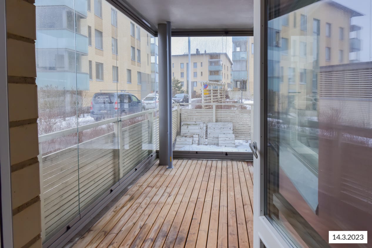 Viehättävän vaaleapintaisen pikkukodin avara pohjaratkaisu antaa sisustajalle todella vapaat kädet kalusteiden sijoittelun suhteen ja kahdesta suunnasta tulviva luonnonvalo lisää tilan tuntua entisestään. Asunnon kruunaa ilta-aurinkoon avautuva piha lasitettuine pihaterasseineen.