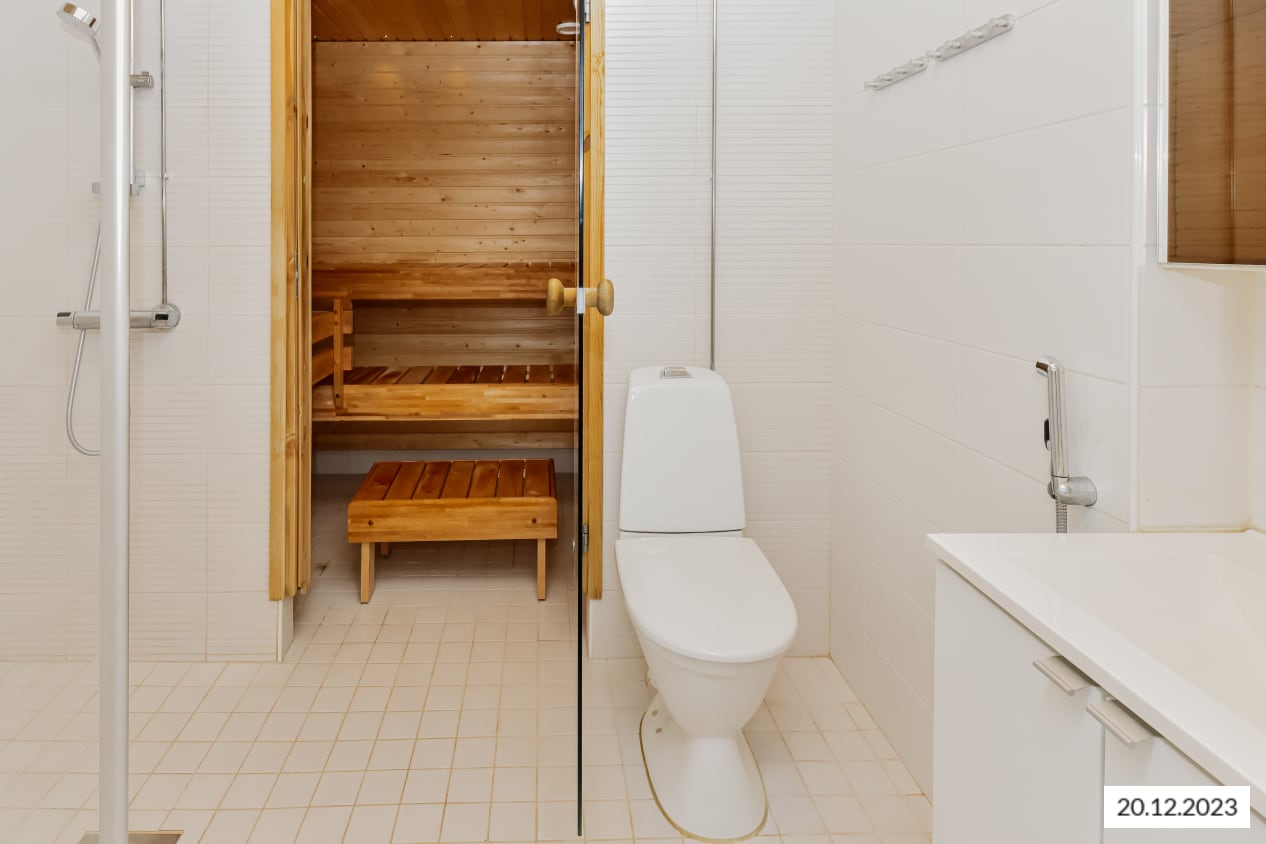 Asuinhuoneissa on valkolakattua tammea mukaileva laminaattilattia. Valkoisella kaakeloidussa kylpyhuoneessa on varpaiden alla ylellinen lattialämmitys ja saunan ilmettä nostaa valokuituvalaistus. Keittiökaapistot ovat valkoiset, samoin keraaminen liesi ja jää-pakastinkaappi. Astianpesukone on integroitu kalusteisiin. Eteiskäytävään valoa heijastavat vaatekaappien peiliovet.