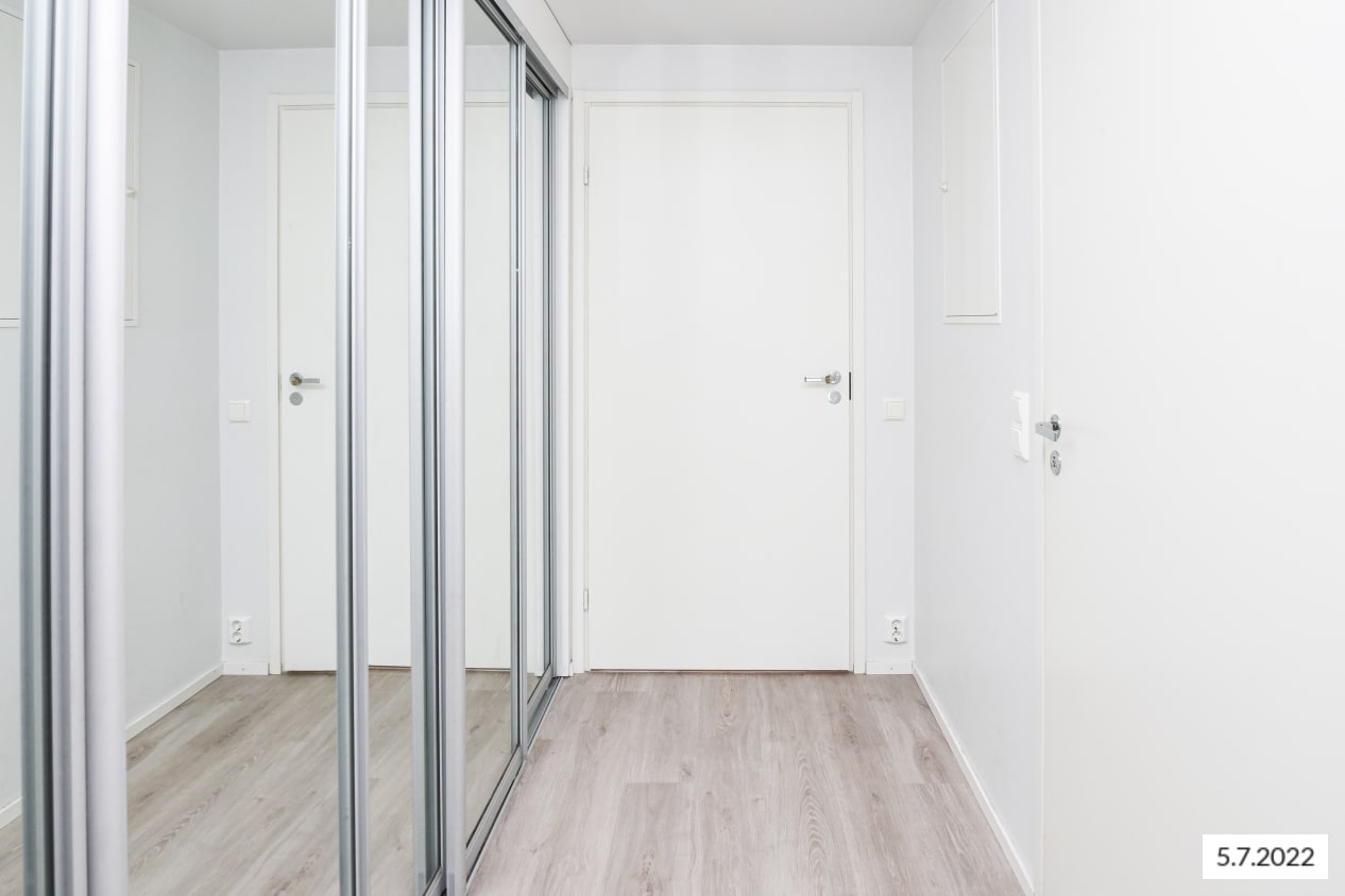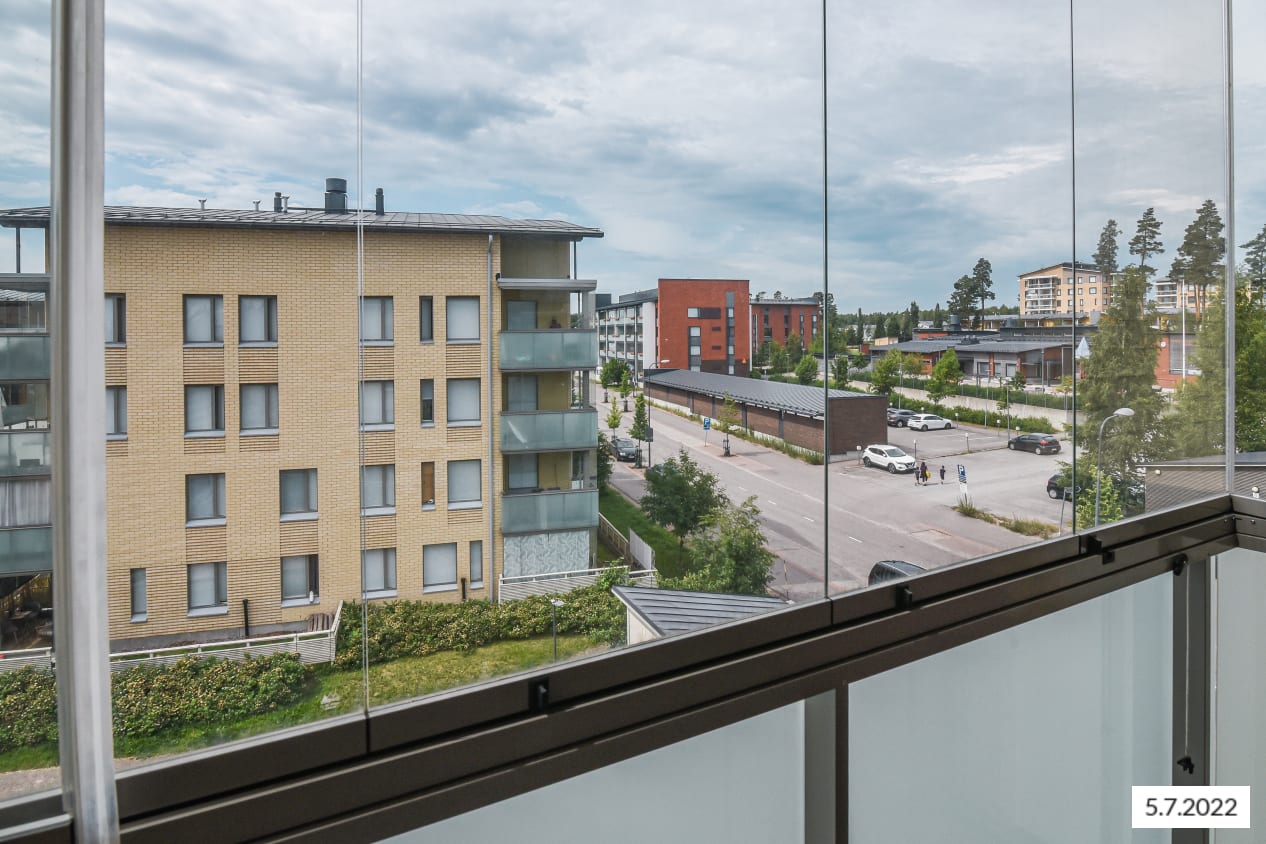 Fiksupohjaisessa vuokra-asunnossa kalusteet löytävät paikkansa vaivattomasti, mutta toisaalta valinnanvaraakin sisustamisessa on. Esimerkiksi keittokomeron vieressä olevaan tilaan mahtuu varsin hyvin pöydän sijasta sänky, ja pöydän voi sijoittaa kylpyhuoneen vastaiselle seinälle. Suojaisa sisäänvedetty parveke avautuu lämpimään ilta-aurinkoon.