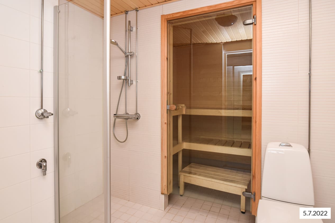 Asuinhuoneissa on valkolakattua tammea mukaileva laminaattilattia. Valkoisella kaakeloidussa kylpyhuoneessa on varpaiden alla ylellinen lattialämmitys ja saunan ilmettä nostaa valokuituvalaistus. Keittiökaapistot ovat valkoiset, samoin keraaminen liesi ja jää-pakastinkaappi. Astianpesukone on integroitu kalusteisiin. Eteiskäytävään valoa heijastavat vaatekaappien peiliovet.
