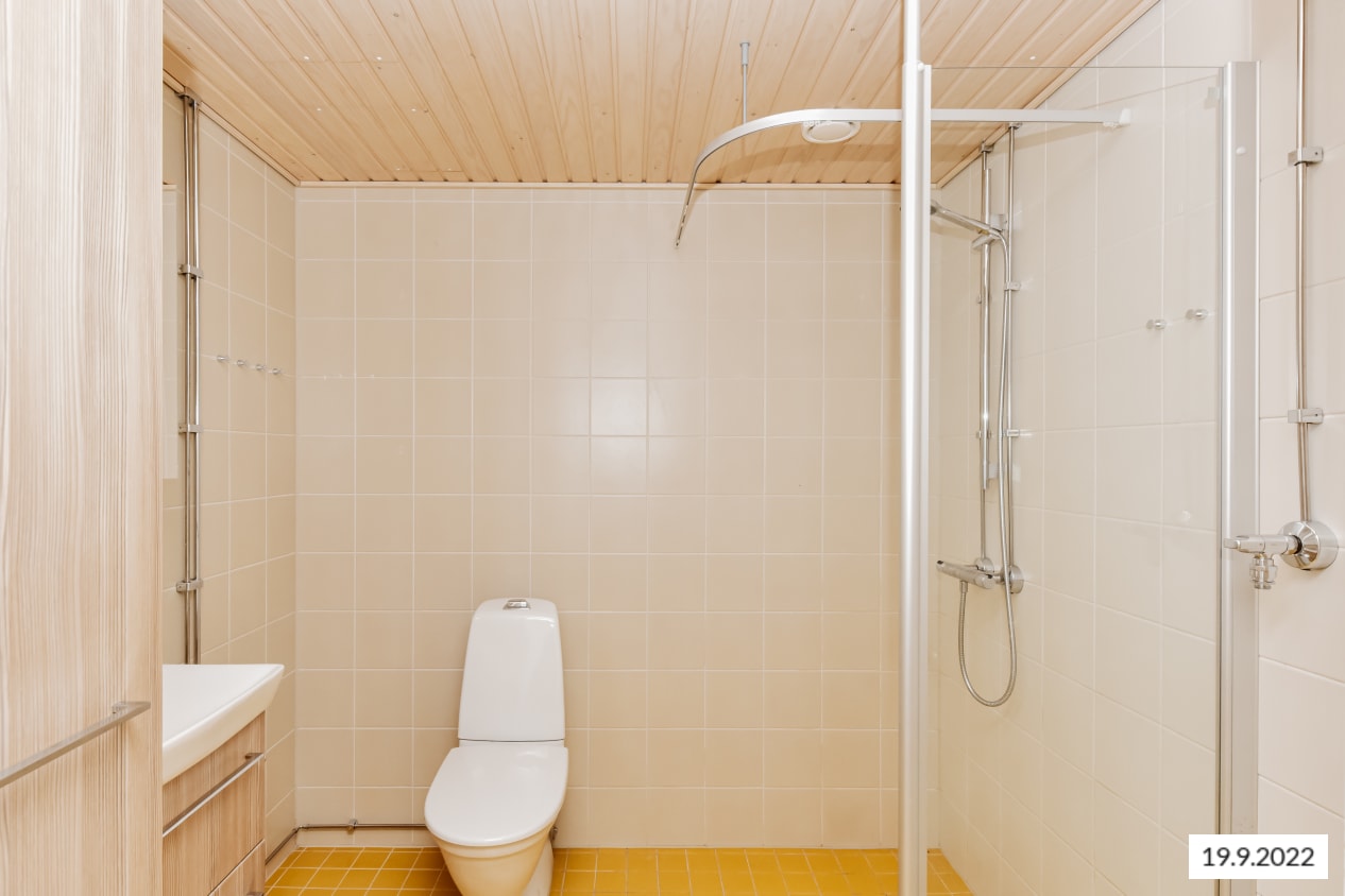 Asuinhuoneiden lattiat ovat valkaistua tammea mukailevaa laminaattia. Keittiön yläkaappien ovet ovat valkoiset ja alakaapeissa on vaaleat puunsyykuvioiset ovet. Ylä- ja alakaappien välinen tila on laatoitettu murretun valkoisella laatalla. Laminaattityötaso on vaalean tammen sävyinen. Varustukseen kuuluu keraaminen liesi, astianpesukone ja kylmälaitteet. Kokonaan laatoitetun kylpyhuoneen lattia on keltaista klinkkeriä ja taitetun valkoisen sävyisiä seiniä elävöittää kerman vaalea tehosteseinä. Pesukoneelle ja kuivausrummulle on tilavaraus.