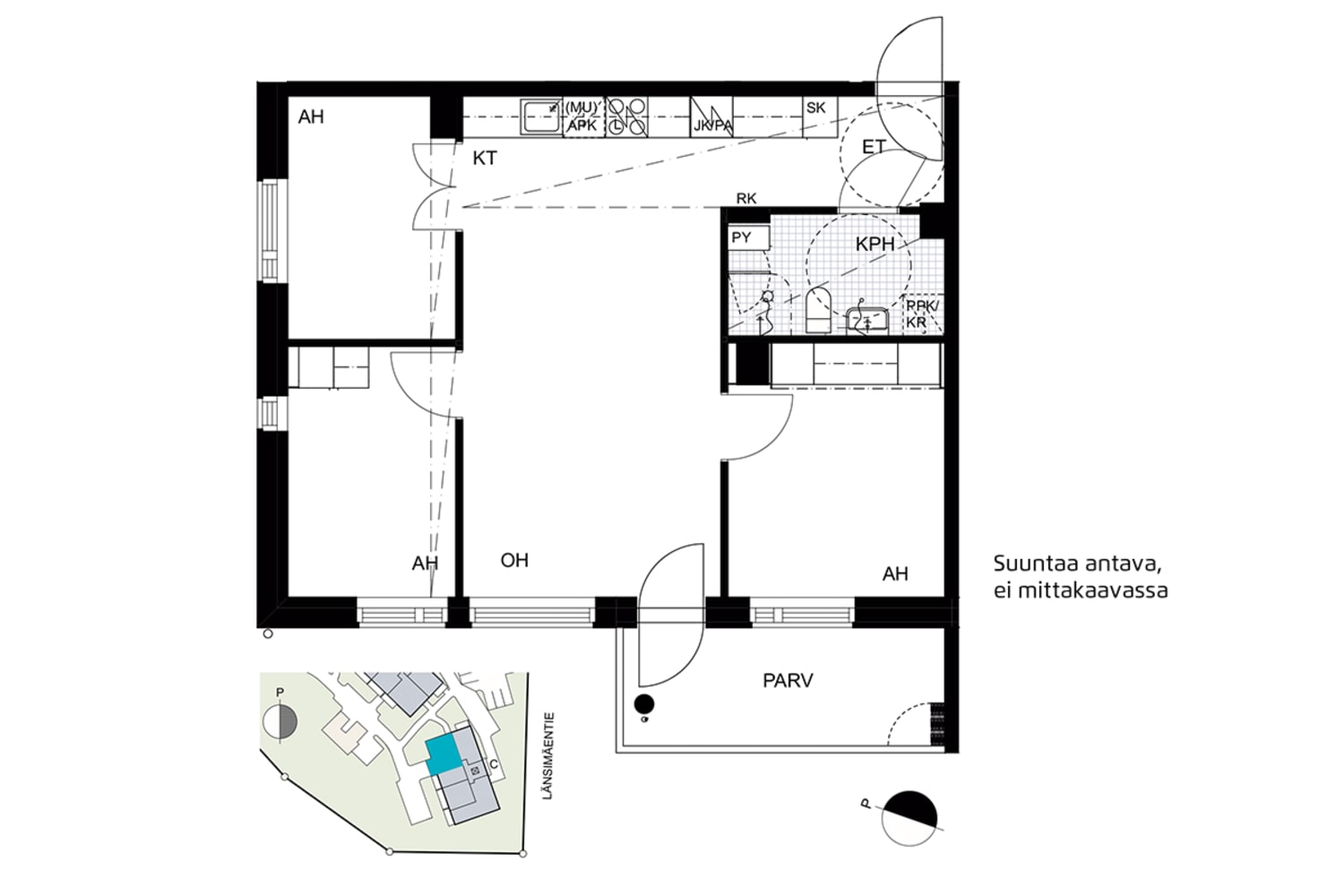 Viihtyisän perheasunnon avoin keittiö ja olohuone muodostavat avaran oleskelualueen, joka on helppo sisustaa mieleisekseen. Makuuhuoneista kaksi on vierekkäin talon ulkoseinustalla ja yksi omassa rauhassaan asunnon toisella puolella. Lasitettu parveke on aurinkoisen pihan puolella.