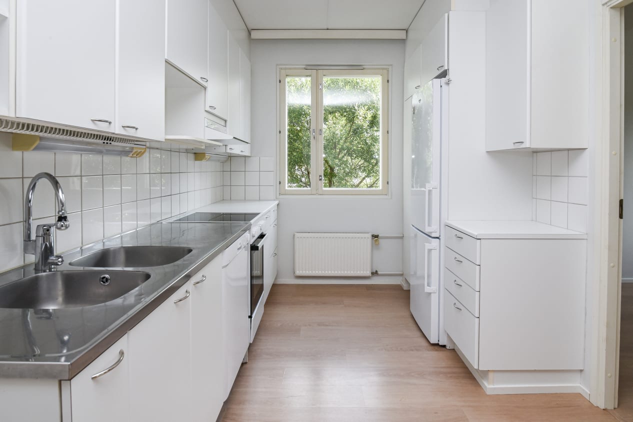 Keittiössä on tilaa astianpesukoneellesi, ja varustukseen kuuluu keraaminen liesi sekä jää-pakastinkaappi. Kylpyhuoneen seinät on laatoitettu, ja pyykinpesukoneelle on liitännät. Omassa saunassa on kätevä tuuletusikkuna.