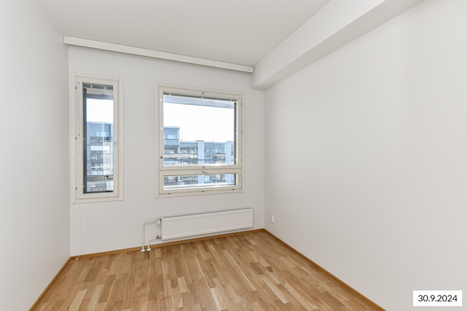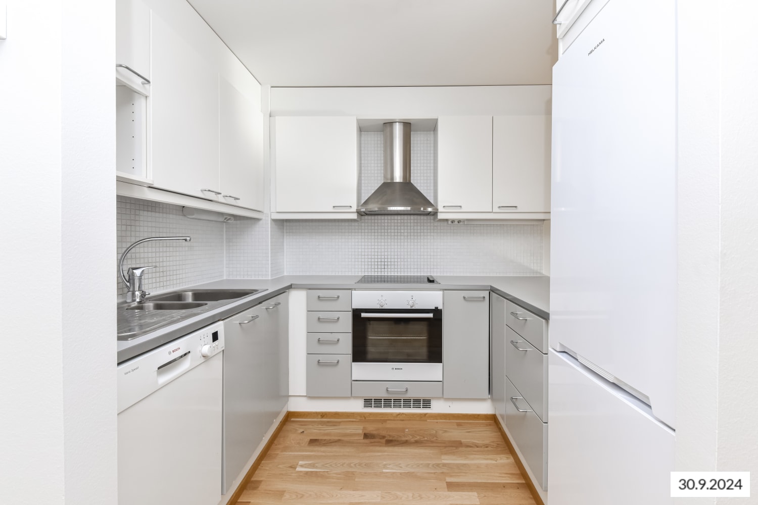 Asuinhuoneissa on kauniit tammilautaparketit. Lattialämmitetyn, kaakeloidun kylpyhuoneen sävyt ovat valkoinen ja vaaleanharmaa. Keittokomerossa on selkeälinjaiset kiiltäväpintaiset kaapistot (yläkaapit valkoiset, alakaapit vaaleanharmaat). Vakiovarusteisiin kuuluvat Boschin keraaminen liesi kalusteuuneineen sekä astianpesukone ja jää-pakastinkaappi. Ikkunoissa on sälekaihtimet.