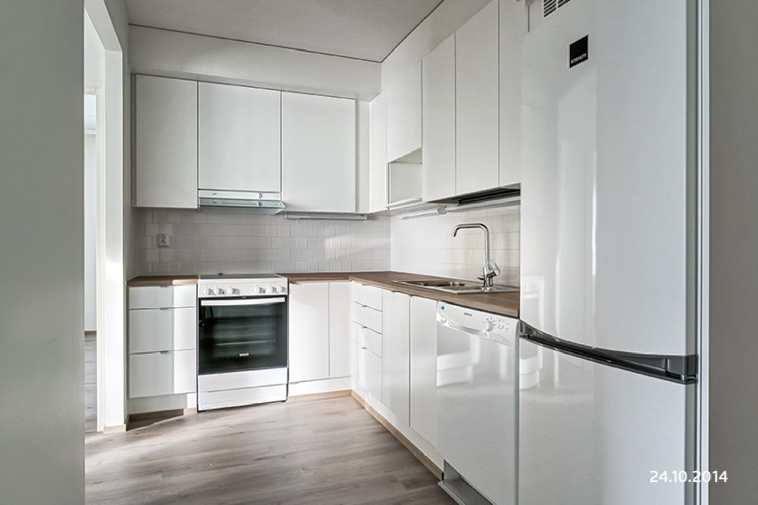 Asuinhuoneiden lattiamateriaalina on käytännöllinen harmaa laminaatti. Keittiön kaapistoissa on valkoiset ovet ja ylä- ja alakaappien välitila on laatoitettu kiiltävän valkoisilla laatoilla, jotka on ladottu ns. tiililadonnalla. Työtasot ovat vaalean puun sävyistä laminaattia. Varusteina on jääkaappipakastin, lattialiesi keraamisine tasoineen ja astianpesukone. Kodinkoneet ovat valkoisia. Pesutilojen seinät on laatoitettu kiiltävän valkoisella ja harmaalla laatalla. Pyykinpesukoneelle ja kuivausrummulle on tilavaraus.