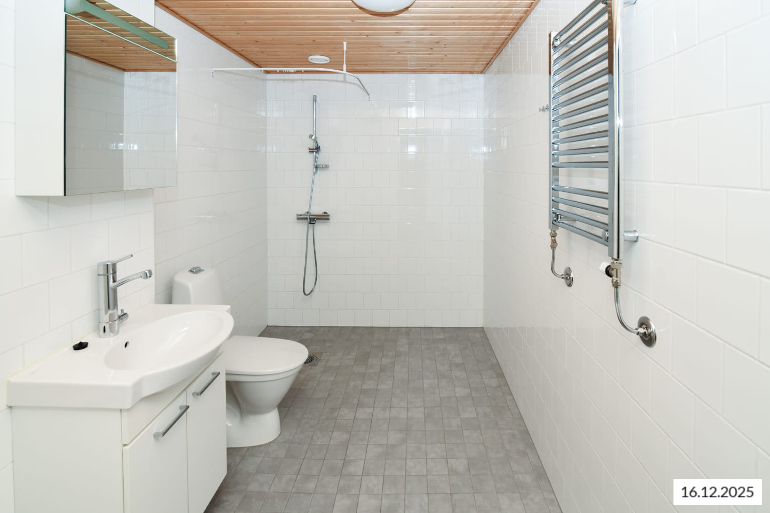 Pesutilojen seinät on laatoitettu kiiltävän valkoisella ja harmaalla laatalla. Pyykinpesukoneelle ja kuivausrummulle on tilavaraus.