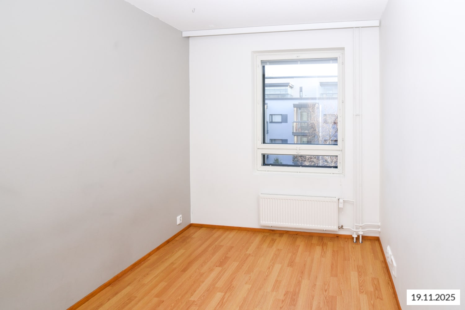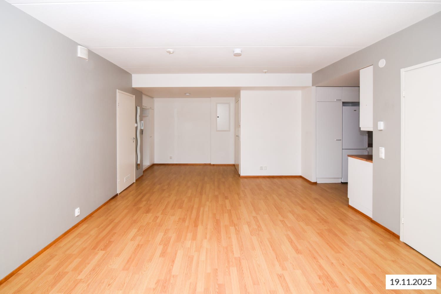 Vaaleasävyinen, olohuoneen ja keittokomeron muodostama avoin tila on helppo sisustaa omalla tyylillä, ja lasitetulla parvekkeella voit nauttia rauhallisen hetken ennen päivän puuhia.