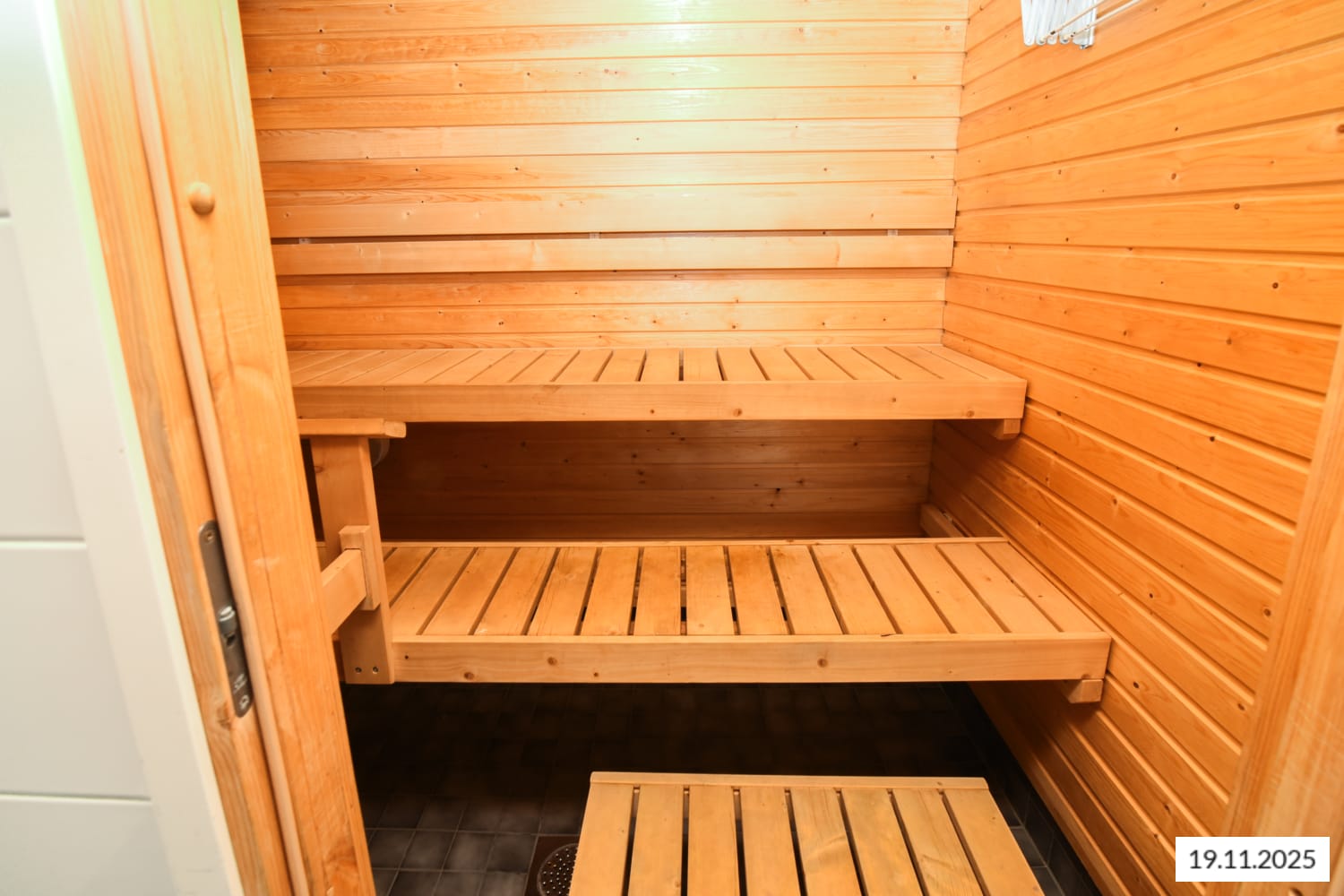 Vaaleanharmaat laatat luovat rauhallisen tunnelman kylpyhuoneeseen, ja siellä on liitännät sekä tilavaraus pesukoneelle. Omassa saunassa rentoudut kiireisen päivän päätteeksi.