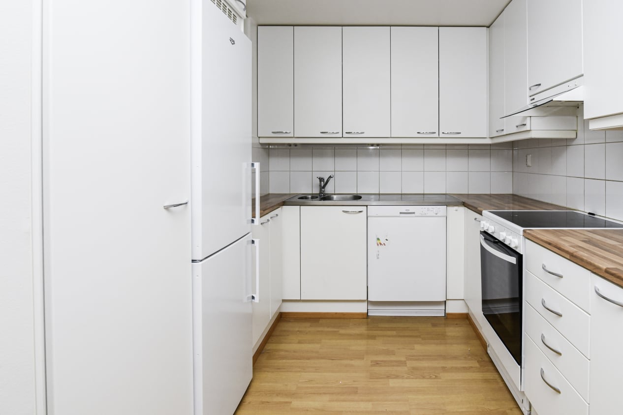 Keittiössä on raikkaan valkoiset kaapistot ja helposti puhtaana pidettävä keraaminen liesi. Astianpesukonekin on valmiina.