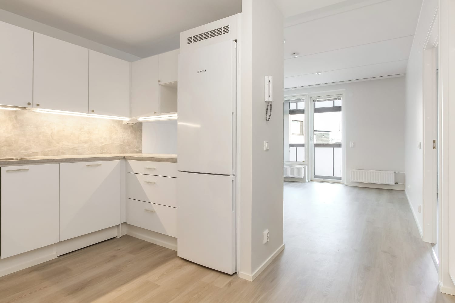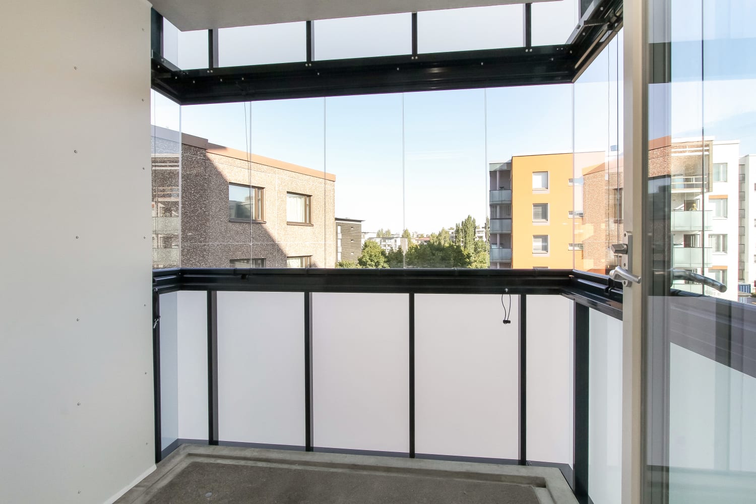 Selkeälinjaisen kaksion vaaleat pinnat miellyttävät silmää ja se on helppo kalustaa omaksi kodiksi. Keittiö on rajattu omaksi tilakseen, mutta kokkailijalla on avoimet näkymät olohuoneen puolelle väliseinän aukon kautta. Pihan puolelle avautuva lasitettu parveke on kesäaikaan kuin lisähuone.