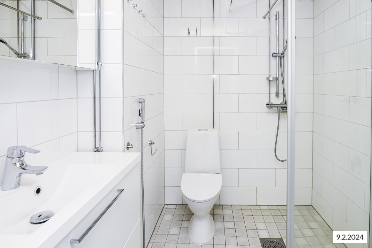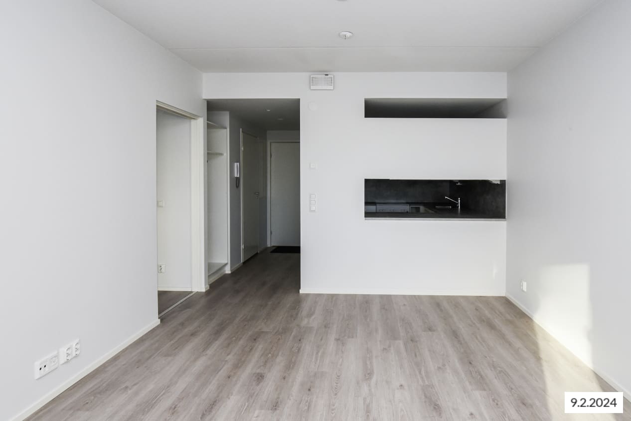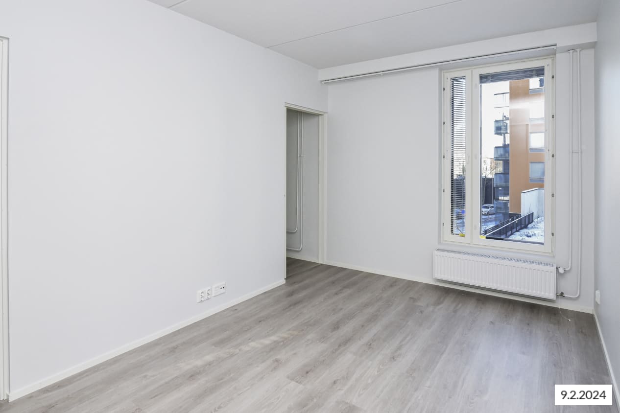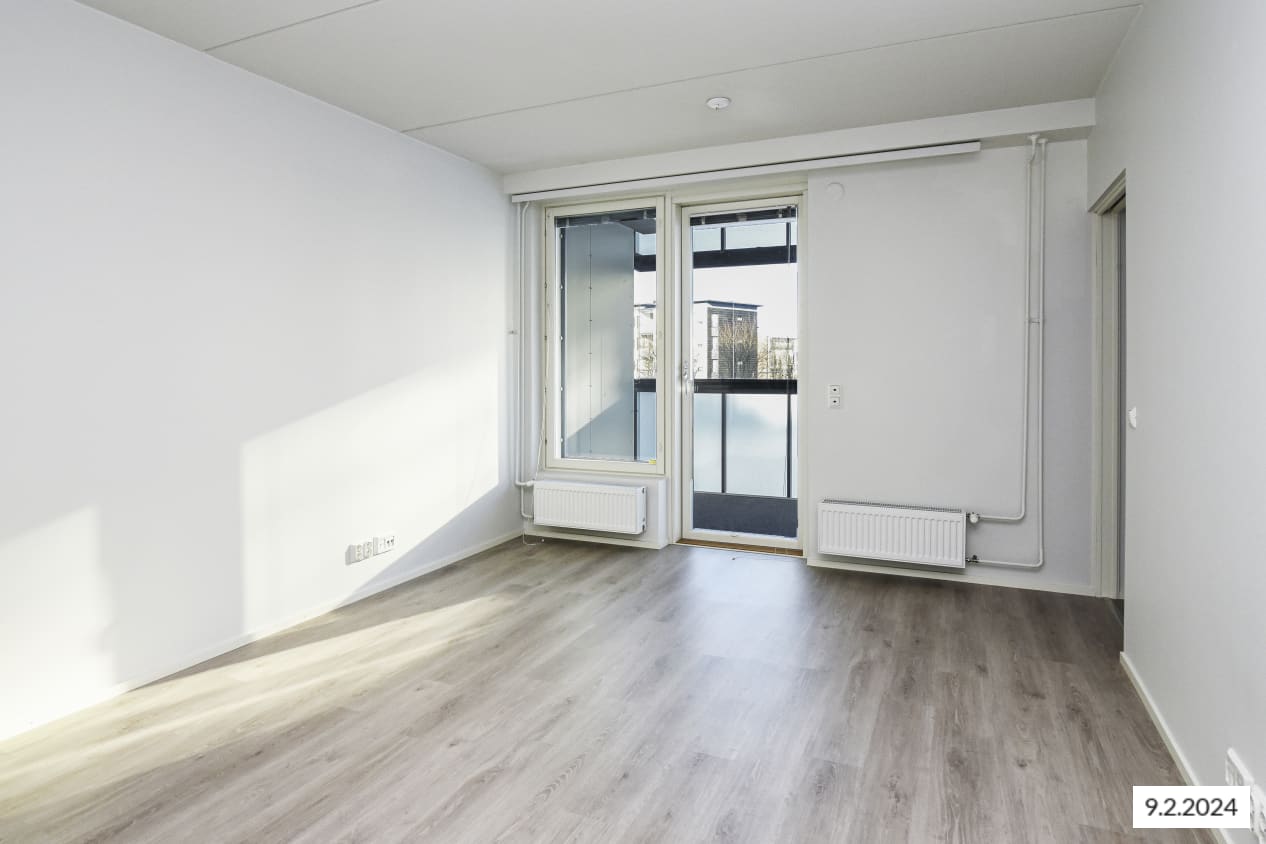 Selkeälinjaisen kaksion vaaleat pinnat miellyttävät silmää ja se on helppo kalustaa omaksi kodiksi. Keittiö on rajattu omaksi tilakseen, mutta kokkailijalla on avoimet näkymät olohuoneen puolelle väliseinän aukon kautta. Pihan puolelle avautuva lasitettu parveke on kesäaikaan kuin lisähuone.