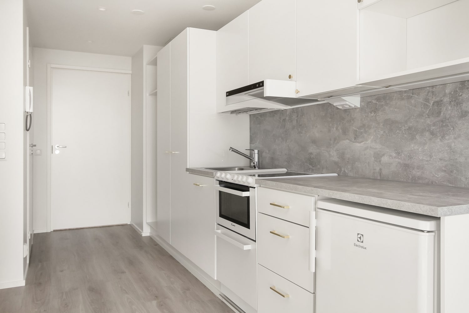 Soman pikkukodin pohjaratkaisu on selkeä ja avoin. Keittiö ja olohuone yhdistyvät viihtyisäksi oleskelualueeksi, joka on helppo kalustaa kodikkaasti. Tilan lattia on vaaleaa laminaattia. Seinät ovat valkoiset. Keittiökaapistot ja kaikki komerot ovat kotimaista Kankarin kalusteen tuotantoa. Keittiössä kaapistojen ovet ovat raikkaan valkoiset ja vetimet ovat harjattua messinkiä. Ylä- ja alakaappien välisessä tilassa on harmaa laminaatti ja työtaso on samaa sävyä. Varusteena on on jääkaappi ja liesi. Kokonaan laatoitetun kylpyhuoneen seinät ovat valkoiset ja lattiat vaalean harmaat. Kylpyhuoneen kalusteet ovat valkoisia. Pesukoneelle ja kuivausrummulle on varaus. Kodin valoisuutta lisää etelään suuntautuva ranskalainen parveke.