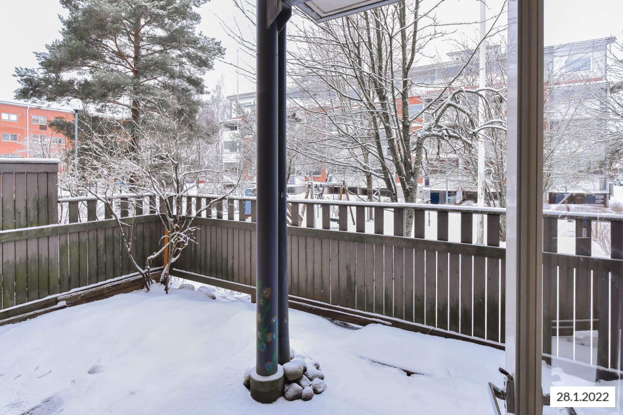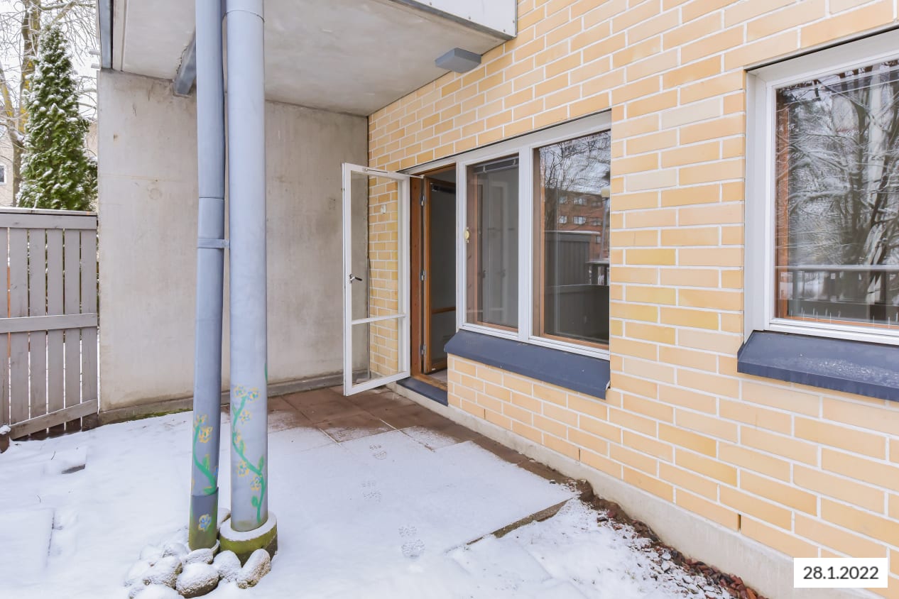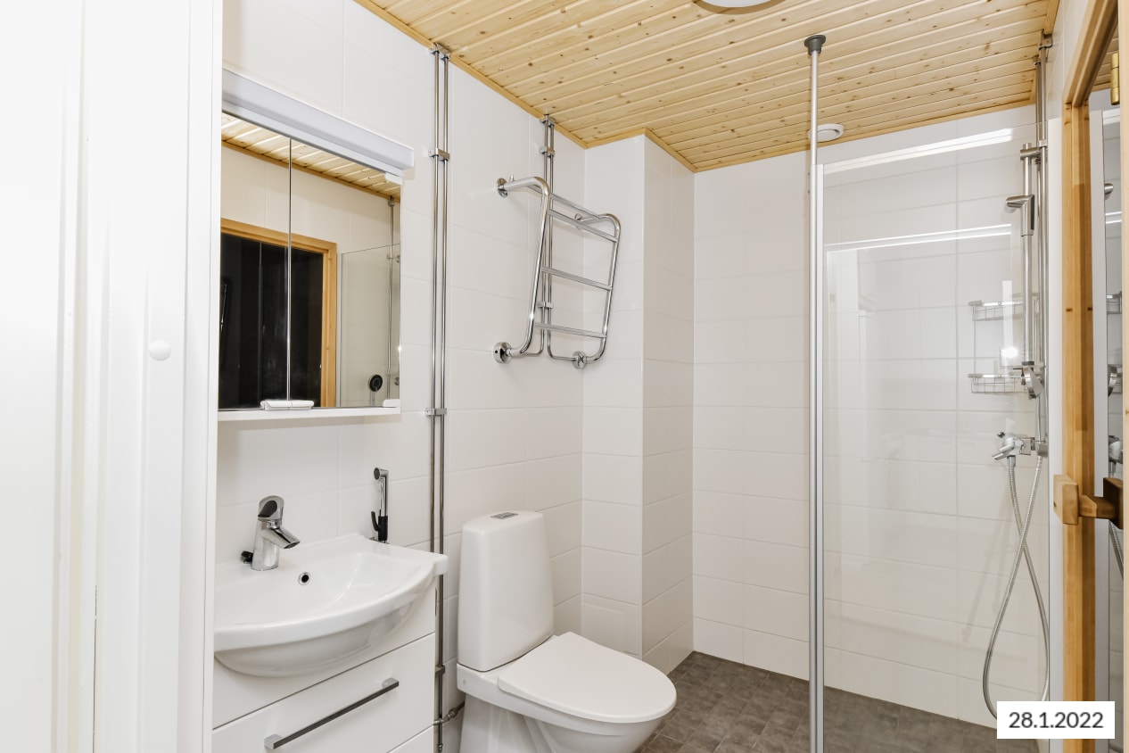 Vuokrattavassa asunnossa on itään antava parveke, Kylpyhuoneessa kosteiden tilojen muovimatto ja kaakeloidut seinät.