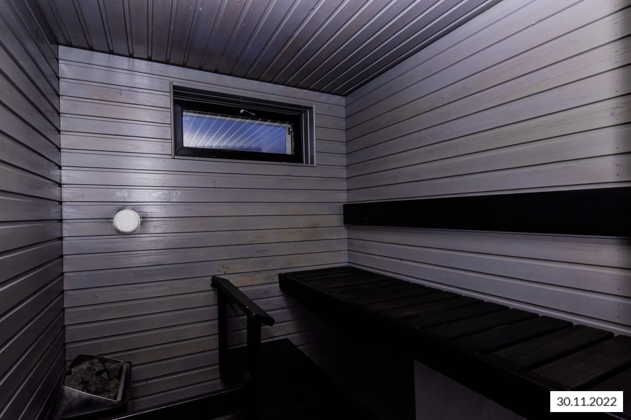 Kylpyhuone on kokonaan laatoitettu harmaalla, sinisellä ja valkoisella laatalla. Kylpyhuoneessa on liitännät pyykinpesukoneelle. Sauna on tyylikästä harmaata paneelia ja omaa ikkunan.