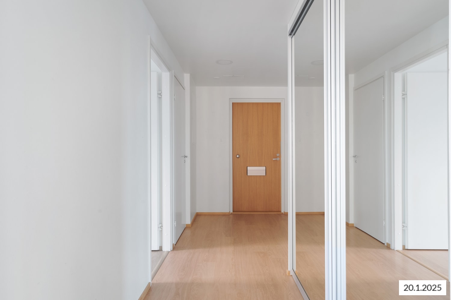 Vaaleasävyisen kaksion ikkunat aukeavat kahteen ilmansuuntaan ja keittiö, ruokailutila ja olohuone muodostavat yhtenäisen valoisan kokonaisuuden. Tila jatkuu lasitetulle parvekkeelle, jonka voi sisustaa omaksi kesäkeitaaksi. Makuuhuoneen yhteydessä on reilun kokoinen vaatehuone.