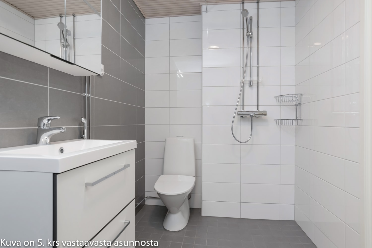 Kylpyhuoneessa seinät ovat isoa, kiiltävän valkoista laattaa. Lattiat ja tehosteseinät ovat harmaata laattaa, jonka sävy vaihtelee portaittain. Valkoiset kylpyhuoneen kalusteet ovat kotimaista Kide-mallistoa. Pesukoneelle ja kuivausrummulle on varaus.