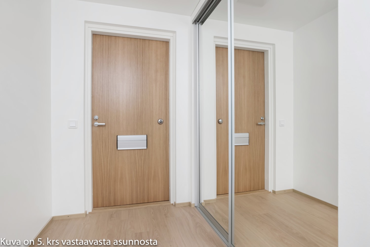 Asuintiloissa lattiat ovat valkaistua tammilankkua mukailevaa laminaattia. Keittiön ja kylpyhuoneen kalusteet ja komerot ovat kotimaista tuotantoa. Keittiössä kaapistojen ovet ovat raikkaan valkoiset. Ylä- ja alakaappien välinen tila on laatoitettu kiiltävän valkoisilla laatoilla ja laminaattitaso on väriltään betonin harmaa. Varustukseen kuuluu keraaminen liesi, astianpesukone, jääkaappipakastin sekä varaus mikroaaltouunille. Kodinkoneet ovat valkoisia.