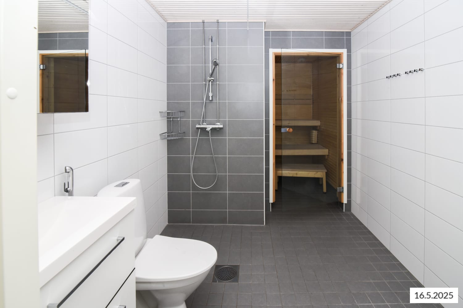 Kylpyhuoneessa seinät ovat isoa, kiiltävän valkoista laattaa. Lattiat ja tehosteseinät ovat harmaata laattaa, jonka sävy vaihtelee portaittain. Valkoiset kylpyhuoneen kalusteet ovat kotimaista Kide-mallistoa. Pesukoneelle ja kuivausrummulle on varaus.
