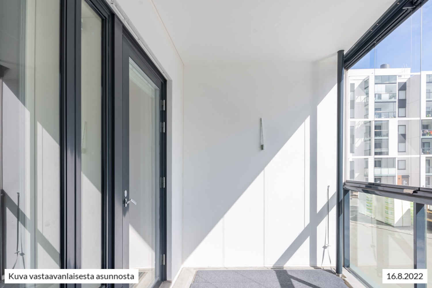 Asuntoihin kuuluu joko lasitettu parveke tai ranskalainen parveke, ja ikkunoissa on sälekaihtimet.
