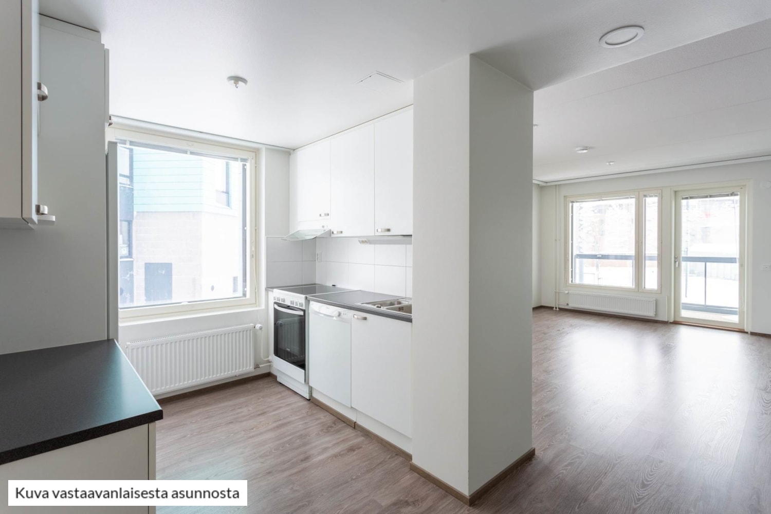 Erillisessä keittiössä on ikkuna ja ruokapöydän saa olohuoneeseen ikkunan ääreen. Kesällä voit jatkaa oleskelutilaa parvekkeelle. Moderni, vaaleasävyinen keittiö on varusteltu induktioliedellä, jääkaappipakastimella tai jenkkikaapilla sekä astianpesukoneella. Välitila on laatoitettu helppohoitoisella, valkoisella laminaattilevyllä.