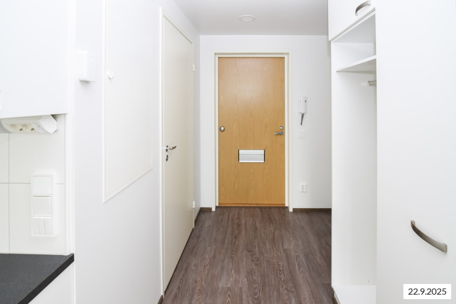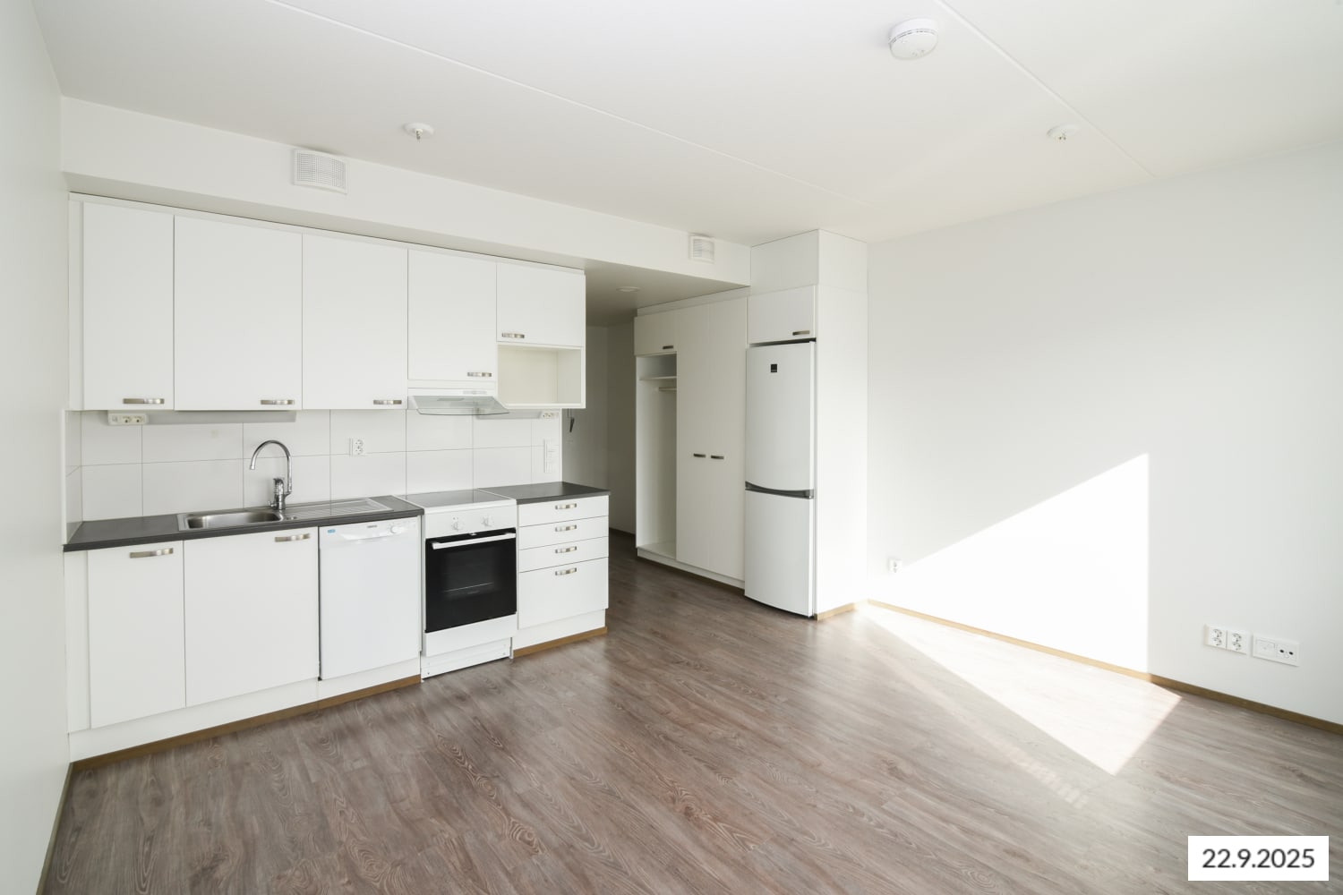 Vaaleasävyisessä yksiössä on hillityn väriset laminaattilattiat ja kylpyhuoneissa laattapinnat. Yhdessä huoneen seinistä on harmaa tehosteväri, joka tuo sisustukseen ilmettä. Pikkukodissa on ranskalainen parveke ja ikkunoissa sälekaihtimet valmiina.